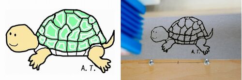 この連載の中では初の新メカニズムをご紹介します。オリジナルの極座標エングレーバーで、上の写真はJPG画像から10x5センチに刻印したところです。 メカニズムの形はこれまでの連載中のXY型と同じに見えますが、実は大違いです。 下にあるのはY軸に沿う水平…